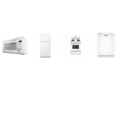 AMANA 4 WHITE APPLIANCE PACKAGE: 18.2 cu. ft. Top-Freezer Refrigerator, ENERGY STAR 59DBA DISHWASHER, 1.6CF OTR MW 300CFM, Gas Range Oven