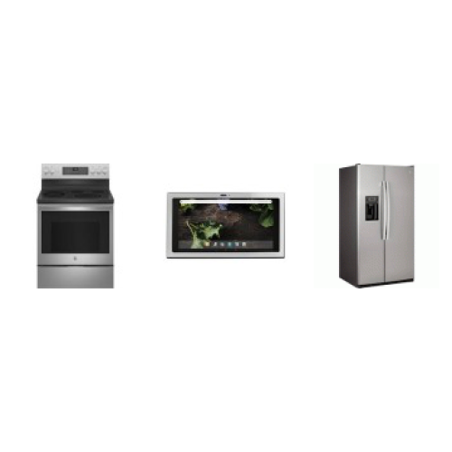 Tags: GE 3 STAINLESS : 30 Inch Smart Integrated Kitchen Hub Built-In Entertainment Ventilation System, 30 Inch Electric Smart Range Air Fry True Convection Oven, 36 Inch Side-by-Side Refrigerator WD