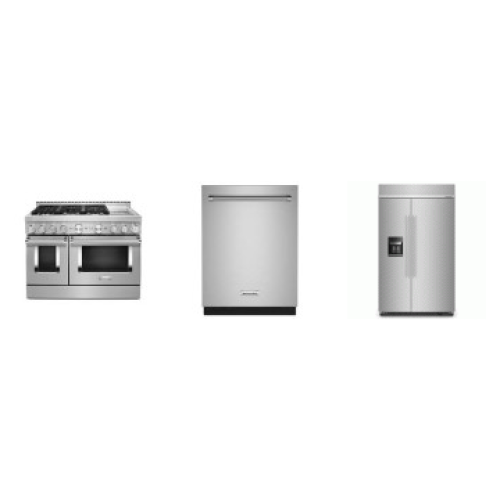 Kitchenaid 3 Stainless Steel Package : 48'' Smart Commercial-Style Gas Range Griddle Even-Heat True Convection, 44 dBA Dishwasher Third Rack Stainless Steel Interior, 48 Inch Built-In Side-by-Side Refrigerator 29.4 Cu. Ft. Ice and Water Dispenser