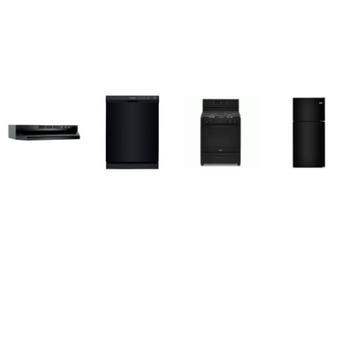 4 BLACK APPLIANCE PKG : WHIRLPOOL GAS RANGE OVEN, BROAN HOOD, FRIGIDAIRE 55 dBA DISHWASHER, MAYTAG 33" Top Freezer Refrigerator 21CF
