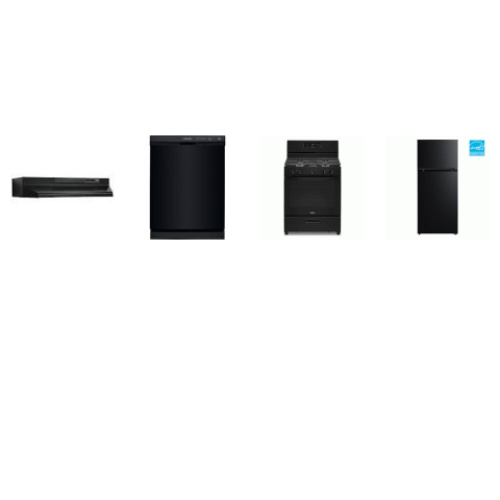 4 BLACK APPLIANCE PKG : GAS RANGE OVEN, DISHWASHER, HOOD, 28" 16.0 cu. ft. Top Freezer Refrigerator