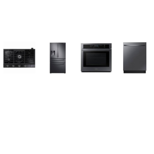 Samsung 4 Black STAINLESS STEEL PKG: 30 Inch Single Wall Oven 5.1 Cu. Ft. Self Clean, 30 inch Gas Cooktop with 22K BTU True Dual Power Burner, 44 dBA Dishwasher Third Rack Half Load, 28 cu. ft. 4-Door French Door Refrigerator External Watrer Ice Disp