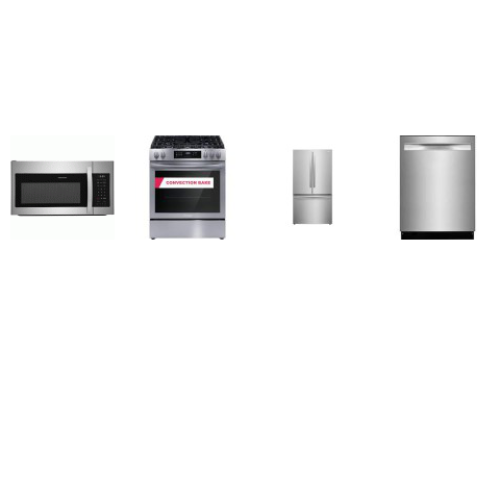 Frigidaire 4PCS STAINLESS : SLIDE IN Gas Range Convection Bake Oven, OTR MW, Dishwasher Stainless Interior 49 dBA, 28.8 Cu. Ft. French Door Refrigerator Water Filt