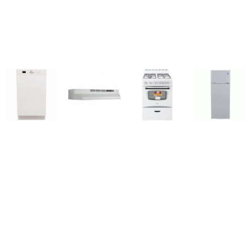 APT SIZE 4 WHITE APPLIANCE PKG: 18 inch Stainless Steel Interior Dishwasher Energy star, 24 inch GAS RANGE GLASS DOOR OVEN, 24 inch Under Cabinet Range Hood, 7.3 cu. ft. Size Refrigerator Top mount freezer