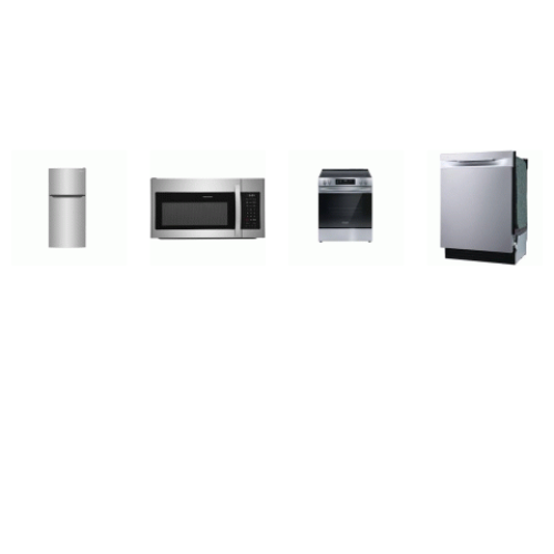 Frigidaire 4 Stainless : 5 Element Electric Slide-In Range Oven, 1.8CF OTR MW, Dishwasher 49dba, 18.3 Cu. Ft. Top Freezer Refrigerator Integrated Handle
