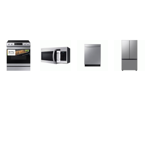 Tags: Samsung 4 STAINLESS STEEL PKG: Slide-in 5 Smoothtop Electric Range Air Fry Self Steam Clean Convection Oven, 1.6cf OTR MW 300CFM, Fully Integrated Dishwasher 48 dBA 3rd Rack ENERGY STAR, 36 Inch Counter Depth Smart 3-Door French Door Refrigerator AutoFill Water Pitcher