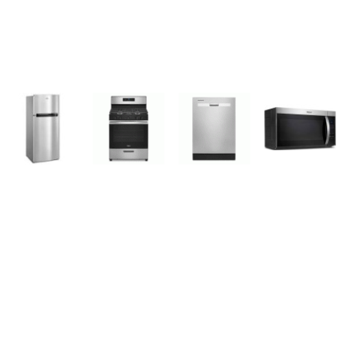 Whirlpool 4 STAINLESS : 55 dBA Dishwasher, 1.7CF OTR MW 300 CFM, Continuous Grates 5 Burners Gas Range Oven, 28 inchW 17.65CF Top-Freezer Refrigerator
