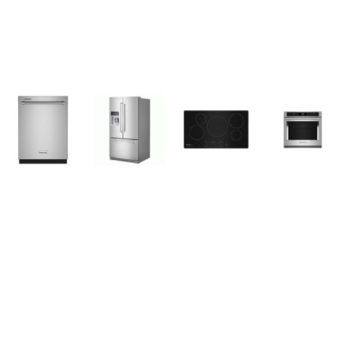 Kitchenaid 4 Stainless Steel Package : 36 Inch Induction Cooktop, 30 inch Single Wall Oven Even-Heat True Convection Air Fry, 39 DBA Dishwasher 3rd Rack Stainless Steel Interior, 26.8 Cu. Ft. French Door Refrigerator Exterior Ice and Water Dispenser