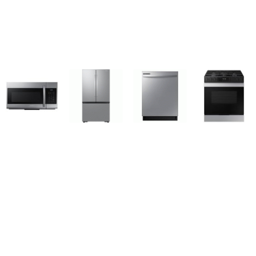 Tags: SAMSUNG 4 STAINLESS STEEL APPLIANCE PKG : Slide-In Smart Gas Range Self Clean Oven, 1.7cf OTR MW 300CFM, Fully Integrated Dishwasher 53DBA, 32 cu. ft. 3-Door French Door Refrigerator Dual Auto Ice Maker
