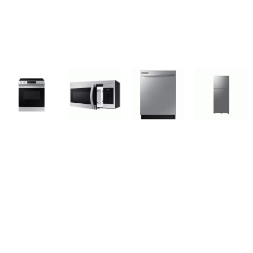 Samsung 4 STAINLESS : Slide In 5 Element Electric Range Convection Self Clean Oven, OTR MW, 53 dBA Dishwasher, 18 cu. ft. Top Freezer Refrigerator with Ice Maker