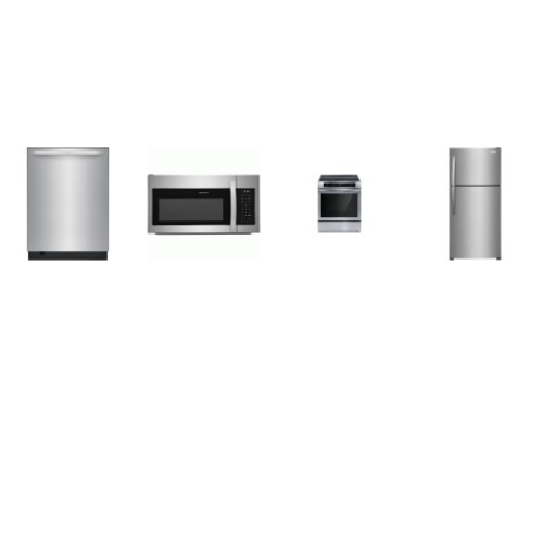Frigidaire 4 Stainless Steel PKG: 30 inch Front Control Induction Slide In Range Convection Bake Oven, 1.8CF OTR MW 300 CFM, 49 dBA Stainless Interior Fully Integrated Dishwasher 3rd Rack, 20 Cu. Ft. Top Freezer Refrigerator