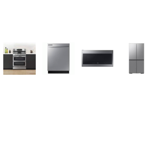 Tags: Samsung 4 STAINLESS STEEL PKG: 30 Inch Gas Smart Range 5 Burners 6.0 Cu. Ft. Convection+ Air Fry Self-Clean Flex Duo Oven, 2.1CF OTR MW 400CFM, Fully Integrated Dishwasher 53 dBA, 36 inch 4-Door Flex Refrigerator 29 cu. ft. Beverage Center