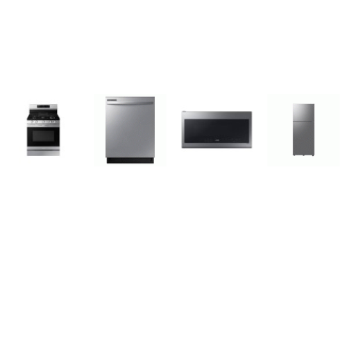Tags: Samsung 4 STAINLESS STEEL PKG: Gas Range No-Preheat Air Fry & Convection Oven, 2.1 cu. ft. Over-the-Range Microwave 400 CFM, Fully Integrated Dishwasher 53DBA, 28"W 18 cu. ft. Top Freezer Refrigerator with Ice Maker