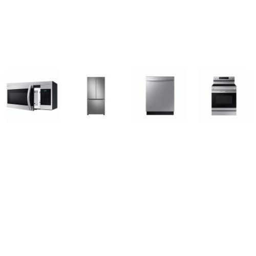 Tags: SAMSUNG 4 STAINLESS STEEL APPLIANCE PKG : Electric Range Convection+ Oven Air Fry, OTR MW, 51dBA 3rd Rack Dishwasher, 33" French Door Refrigerator AutoFill Water Pitcher Ice Maker