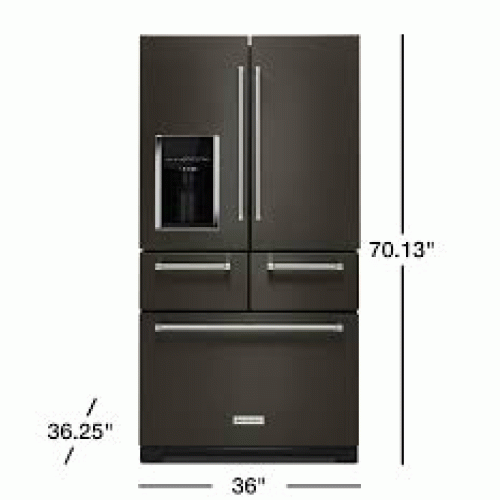 Tags: 36 Inch French 5-Door Refrigerator 25.8 cu. ft 5 Shelves 2 Soft-Close Drawers Preserva Food Care System SatinGlide Crispers Exterior Ice/Water Dispenser LED Lighting Sabbath 35.62"W 36.25"D 70.125"H Black Stainless Steel PrintShield