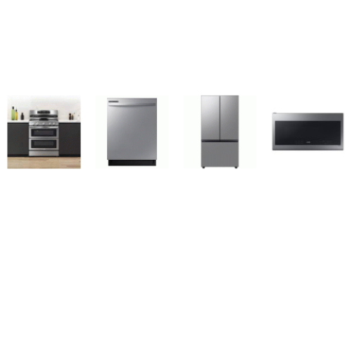 Samsung 4 STAINLESS : Gas Range Convection+ Air Fry Flex Duo Oven, 2.1CF OTR MW 400CFM, Dishwasher 53 dBA, FRENCH 4-Door Flex Counter Depth Refrigerator AutoFill Water Pitcher