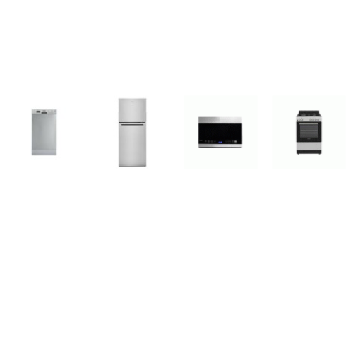 APT SIZE 4 STAINLESS APPLIANCE PKG : DANBY 24" GAS RANGE OVEN, 24" OTR MW, 18" DISHWASHER, AND WHIRLPOOL 24" 11.6CF Top-Freezer Refrigerator