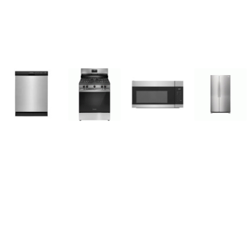 Frigidaire 4 Stainless : 5 brs Gas Range Oven, 1.7CF OTR MW 300 CFM, Dishwasher 55dba, 26CF 36"W Side-by-Side Refrigerator