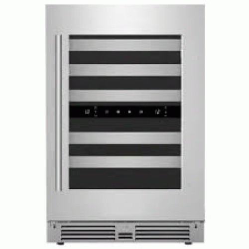 Tags: 46 Bottle Dual-Zone Wine Cooler Beech Wooden Shelves 41-64°F Stainless Steel Trim White / Warm White / Blue LED Light ENERGY STAR Reversible Doors 23.8"W 23.6"D 34.1"H Stainless Steel