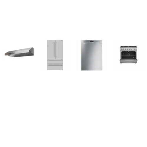 Tags: 4 STAINLESS STEEL APPLIANCE PKG : Forno 36" Gas Range Convection Oven 6brs, Faber 36 Inch Hood 400 CFM, Smeg 48dBA Dishwasher, Sharp Counter-Depth French 4-Door Refrigerator Ice Maker
